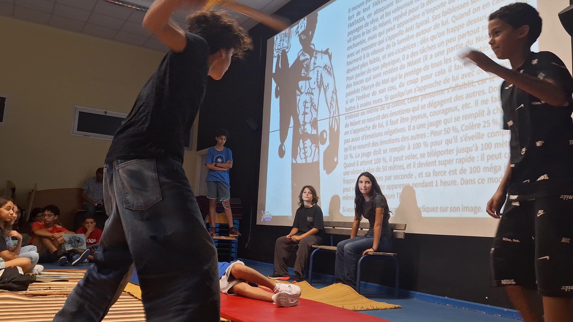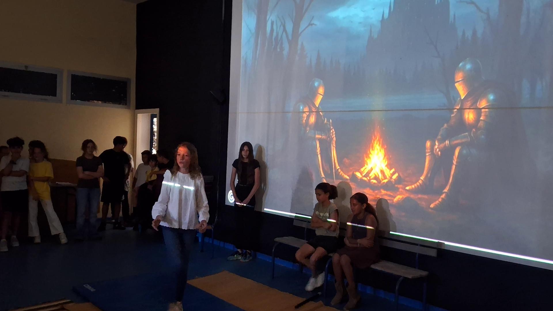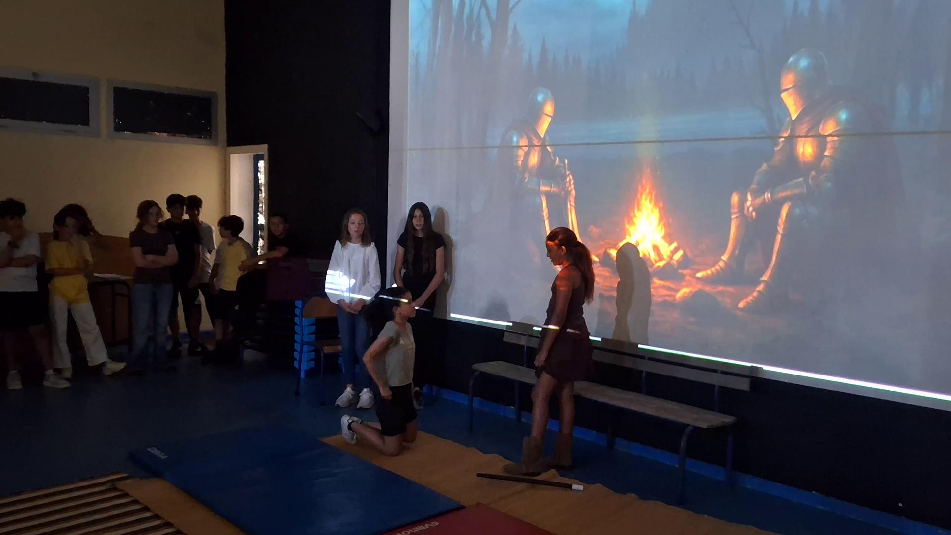4 équipes sur 24 avaient réussi à se qualifier pour les demi-finales de ce tournoi, où les élèves devaient raconter leurs propres aventures épiques imaginaires dans Fantasia, en réexploitant les techniques apprises lors de leur atelier auprès d'un conteur professionnel. Les 6èmes 1 ont, quant à eux, proposé une très belle version théâtralisée de la nouvelle "le dragon" de Ray Bradbury qu'ils avaient étudiée en classe. Tous les élèves ont voté pour départager les meilleurs spectacles, et c'est finalement l'équipe de 5ème 3 "les Guerriers et les Licornes" (O'Sean, Rita, Adam et Omar) qui a remporté le tournoi de contes.